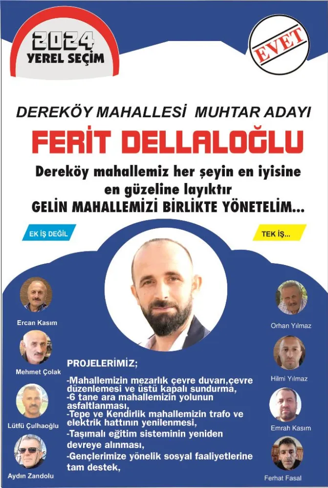 Çiçeği burnunda muhtara dayı Dellaloğlu, mahallesinde eksiği hissedilen elektrik trafosunun hizmete alınacağını, mahalle halkının ortaklaşa kullandıkları mezarlığın dağınık ve çirkin görüntüsündan kurtarıp mahallesine yakışır hale getireceğinin, bazı asfaltsın sokakların sıcak asfaltla buluşacağının ve gençleri kötü alışkanlıklardan korumak, gençleri,vatanına, bayrağına, milletine bağlı gençler olarak yetişmeleri adına sosyal faaliyetlere hız ve destek vereceklerini müjdeledi.