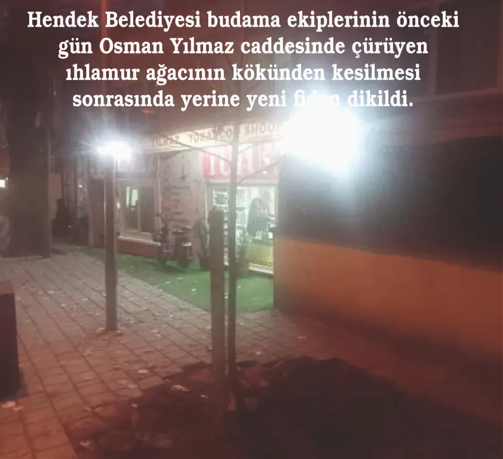 İnşallah yarın ya da hafta sonu da ilçemiz Büyükcami bahçesinde bulunan ve Hendek orman İşletme müdürlüğünde kayıtlı statüde bulunan çınar ağacının üst taraflarındaki çürüyen dallarını kesmek sureti ile çalışmalarımız devam edecek. İlçe genelinde çürümesi sebebi ile kökünden kesilen ağaçların yerine de yeni fidan dikme işlemlerimiz devam ediyor" dedi.