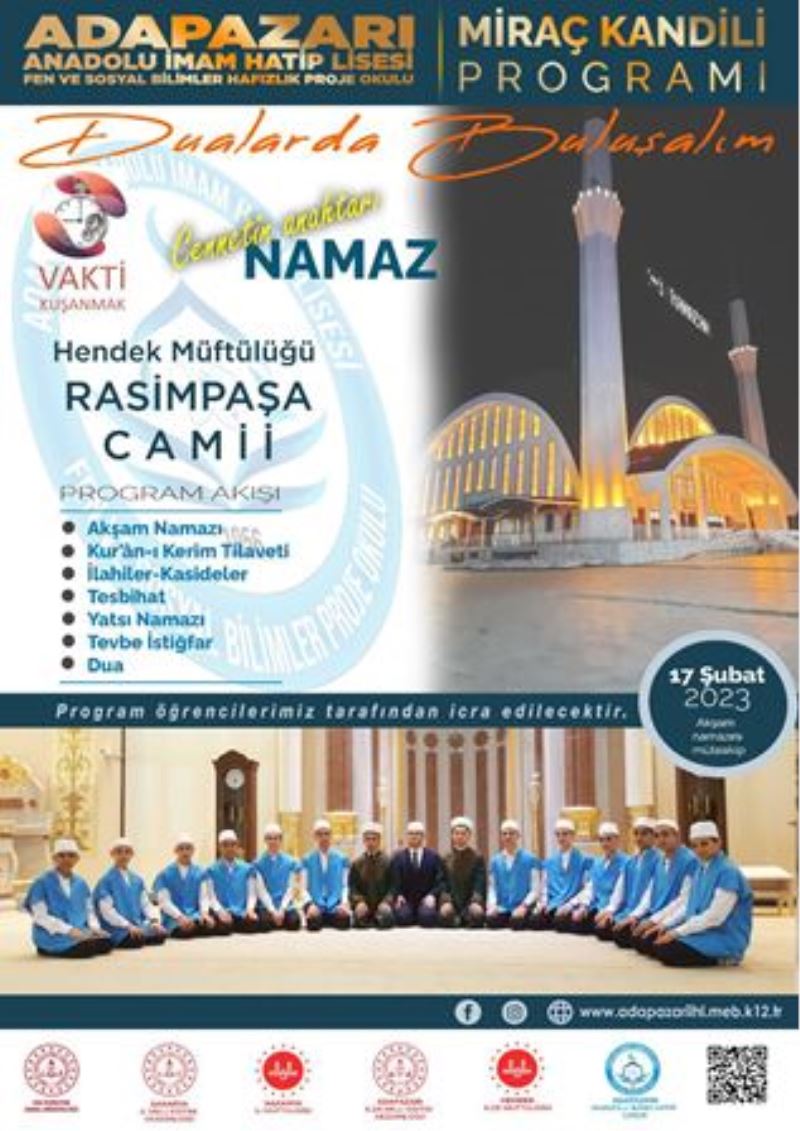 Hendek İlçe Müftülüğünden yapılan duyuruya göre bu akşam Rasimpaşa camisinde  Miraç gecesi programı düzenlenecek. Akşam namazı ile başlayacak olan program yatsı namazı ile son bulacak.