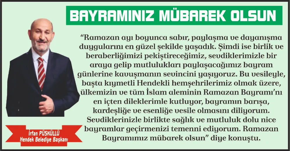 Hendek Belediye Başkanı İrfan Püsküllü İslam aleminin ve ilçemiz vatandaşlarımızın Ramazan bayramını bu ifadelerle kutladı.