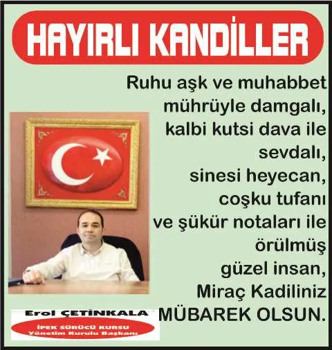 İpek Sürücü Kursu Yönetim Kurulu Başkanı Erol Çetinkala Miraç Kandili mesajı yayınladı.