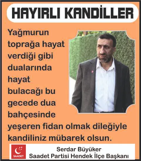 Saadet Partisi Hendek İlçe Başkanı Serdar Büyüker, yayınladığı Miraç Kandili mesajında;