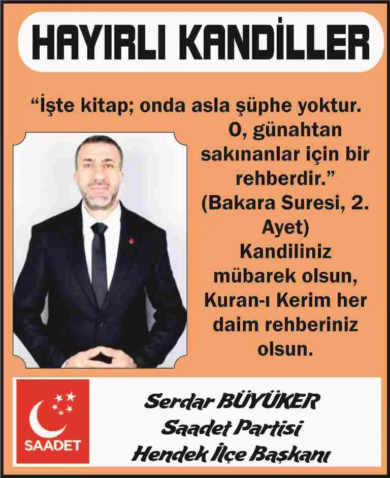 Saadet Partisi Hendek İlçe Başkanı Serdar Büyüker İslam Aleminin mübarek Berat Kandilini kutladı.