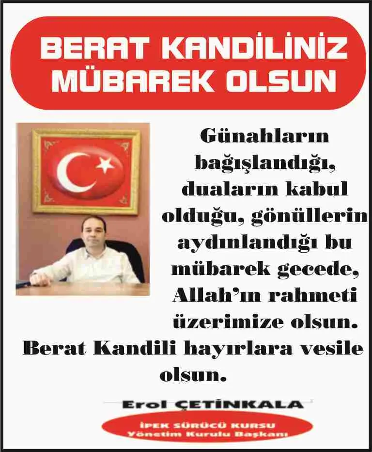 İpek Sürücü Kursu yönetim kurulu başkanı, iş insanı Erol Çetinkala Berat Kandili mesajı yayınladı.