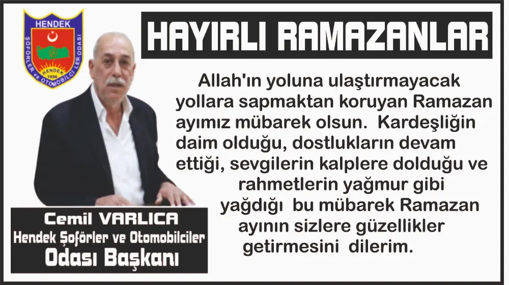 Hendek Şoförler ve Otomobilciler Odası Başkanı Cemil Varlıca yayınladığı tebrik mesajı ile İslam Aleminin mübarek Ramazan ayını tebrik etti.