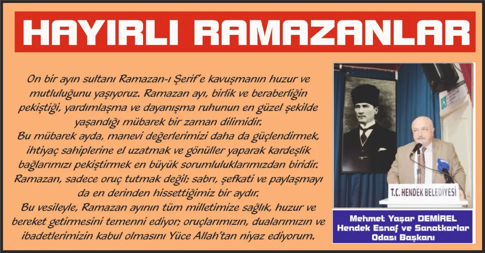 Hendek Esnaf ve Sanatkarlar Odası Başkanı Mehmet Demirel hayırlı Ramazanlar diledi.