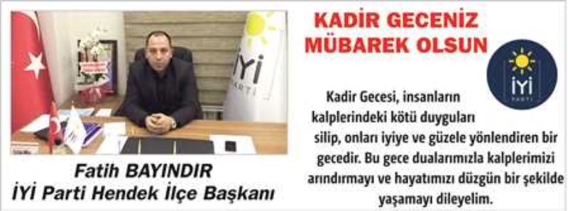 İYİ Parti Hendek İlçe Başkanı Fatih Bayındır, İslam Aleminin mübarek kadir gecesinin İslam alemine ve ülkemize hayırlara vesile olmasını temenni etti.