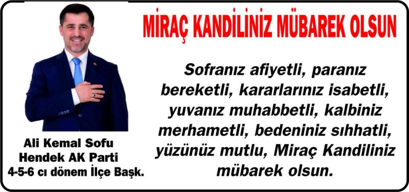 Hendek AK Parti 4-5-6 cı dönem ilçe başkanlığını yapan iş insanı Ali Kemal Sofu yayınladığı mesajla İslam aleminin miraç kandilini şu sözlerle kutladı.