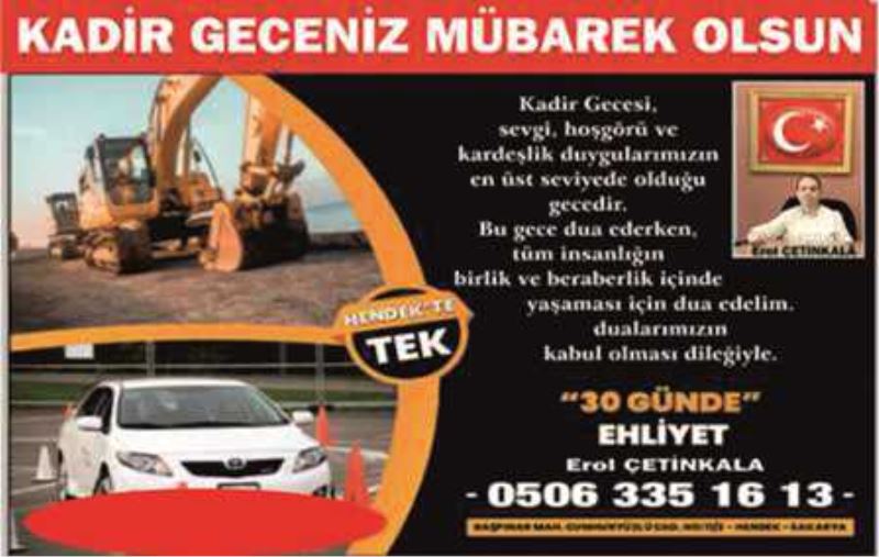 İpek Sürücü Kursu işletme sahibi ve Hendek Anadolu Lisesi Okul Aile Birliği Başkanı Erol Çetinkala yayınladığı mesajında Kadir Gecesini kutladı.