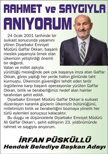 BBP Hendek Belediye Başkan Adayı İrfan Püsküllü, yayınladığı mesajında Şehidimizi şu sözlerle andı.