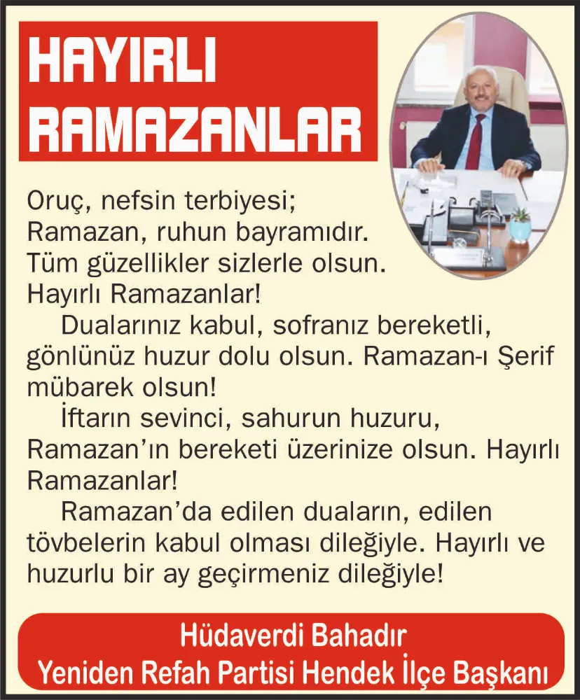 Hendek YRP İlçe Başkanı Hüdaverdi Bahadır yayınladığı mesaj ile Ramazan ayını tebrik etti.