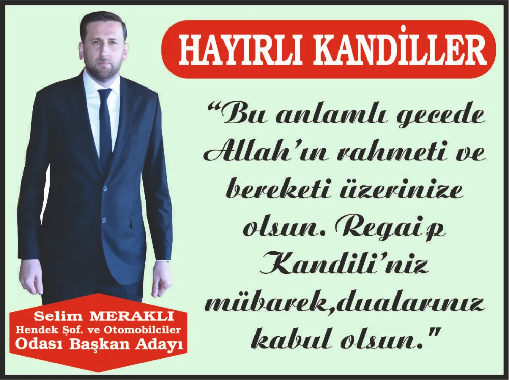 Hendek Şoförler ve Otomobilciler Odası Başkanlığına adaylığını açıklayan Selim Meraklı İslam aleminin Regaip kandilini şu ifadelerle kutladı.