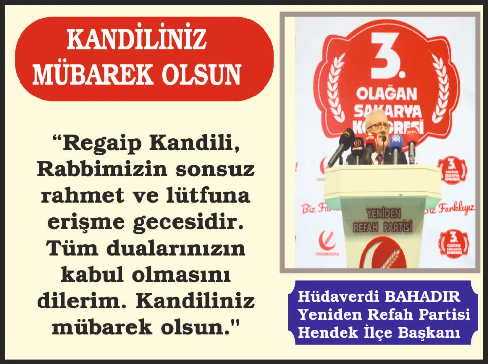 2019-2024 yılları arasında Hendek Belediye Başkan yardımcılığı görevinde adeta bir başkanmışcasına ilçenin çok yerine eli değen ve ilerleyen süreçte ahde vefadan mahrum edilmesi neticesinde siyaseten yolunu ayırarak Hendek Yeniden Refah Partisi saflarına katılıp kısa sürede de yapılan ilçe kongresinde üyeler tarafından ilçe başkanlığına getirilen Hüdaverdi Bahadır, İslam Aleminin Regaip Kandilini kutladı.