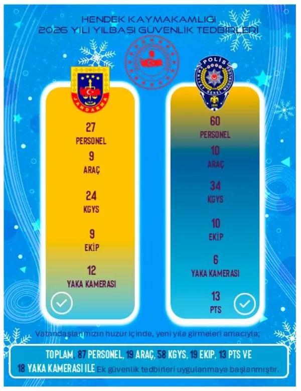 Yeni yıl gecesinde Hendek’te Emniyet ve Jandarma ekiplerinden oluşan toplamda 87 Personel, 19 Araç, 19 Ekip, 58 KGYS, 13 PTS ve 18 Yaka kamerası ile İlçenin bir çok farklı noktasında denetim ve uygulamalar gerçekleştirerek Vatandaşların güvenliği ve huzuru için görev yapacak.