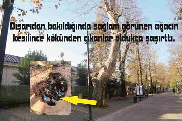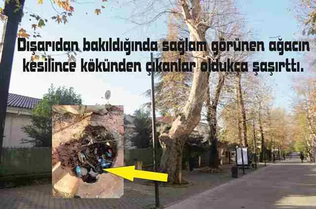 Üniversite önünde bugün öğlenden sonra kesilen çınar ağacında dışarıdan bakıldığında bariz bir çürümenin görülmemesi biz vatandaşları aldatmasın. Yetkililerin kontrolleri sonucu kökünden kesilmesine karar verilen çınar ağacının kökünün içinden inanılması güç bir fotoğraf çıktı ki ağacın kökünün çürümüş ve içerisinde plastik su şişeleri ve teneke meyve suyu kutularının çıkması oldukça şaşırtıcıydı.