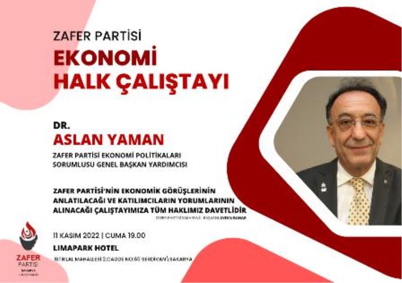 Düzenlenen program İstiklal Mahallesi 2. Cadde No:65 Serdivan-Sakarya’da Limapark Otel konferans salonunda 11 Kasım akşamı saat 19.00’da başlayacak. Programa Ekonomiden sorumlu Zafer Partisi Genel Başkan Yardımcısı Dr. Aslan Yaman konuşmacı olarak katılacak.