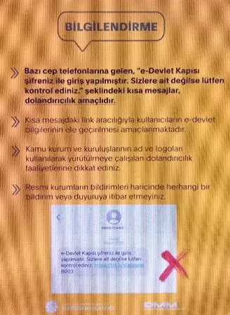 Bazı cep telefonlarına gelen, "e-Devlet Kapısı şifreniz ile giriş yapılmıştır. Sizlere ait değilse lütfen kontrol ediniz." şeklindeki kısa mesajlar, dolandırıcılık amaçlıdır.