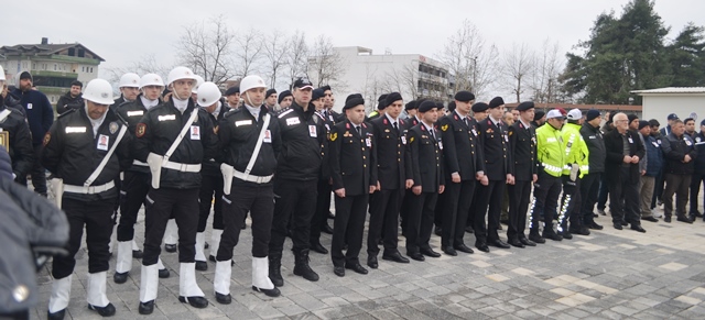 Törene protokol üyelerinin yanı sıra polis memurunun annesi, ailesi, yetim kalan kızı ile birlikte aile yakınlarıyla birlikte ilçe halkı katıldı.