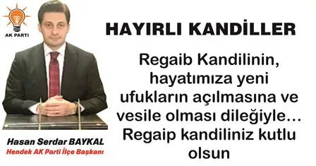 Hendek AK Parti İlçe Başkanı Hasan Serdar Baykal, İslam Aleminin Regaip Kandilini kutladı.