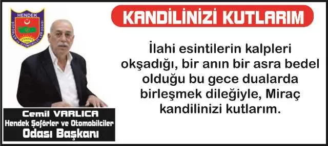 Hendek Şoförler ve Otomobilciler Odası Başkanı Cemil Varlıca İslam Aleminin Miraç Kandilini kutladı.