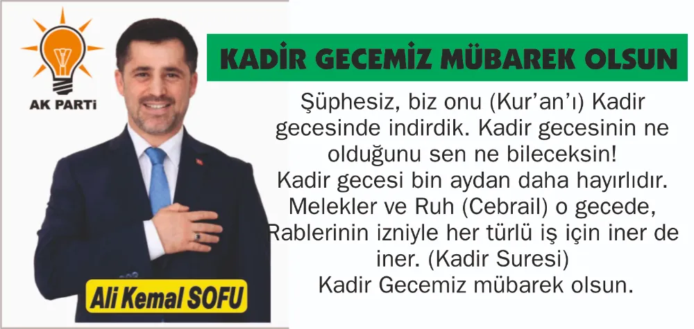 2019 yılı AK Parti Hendek Belediye başkan adayı ve iş insanı Ali Kemal Sofu İslam Aleminin mübarek Kandil Gecesini şu ifadelerle kutladı.