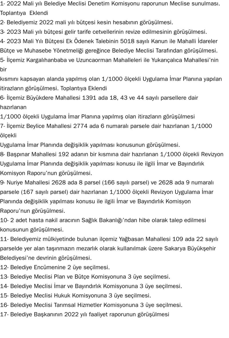 Eğer bir değişiklik yapılmaz ise meclis 17 gündem maddesi ile 5 Nisan Çarşamba günü meclis toplantı salonunda saat 15.00'te toplanacak.