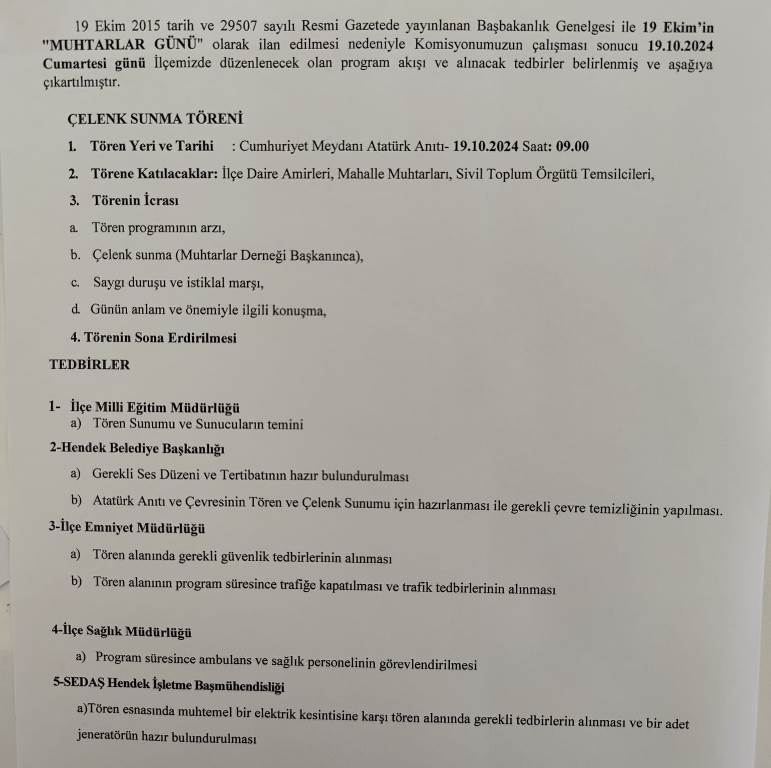 Tören dolayısı ile Atatürk anıtın önünde çelenk konulacak, saygı duruşuna müteakiben İstiklal Marşı okunacak. Günün anlam ve önemini anlatan konuşma Hendek Muhtarlar derneği Başkanı Halit Bektaş tarafından yapılacaktır.