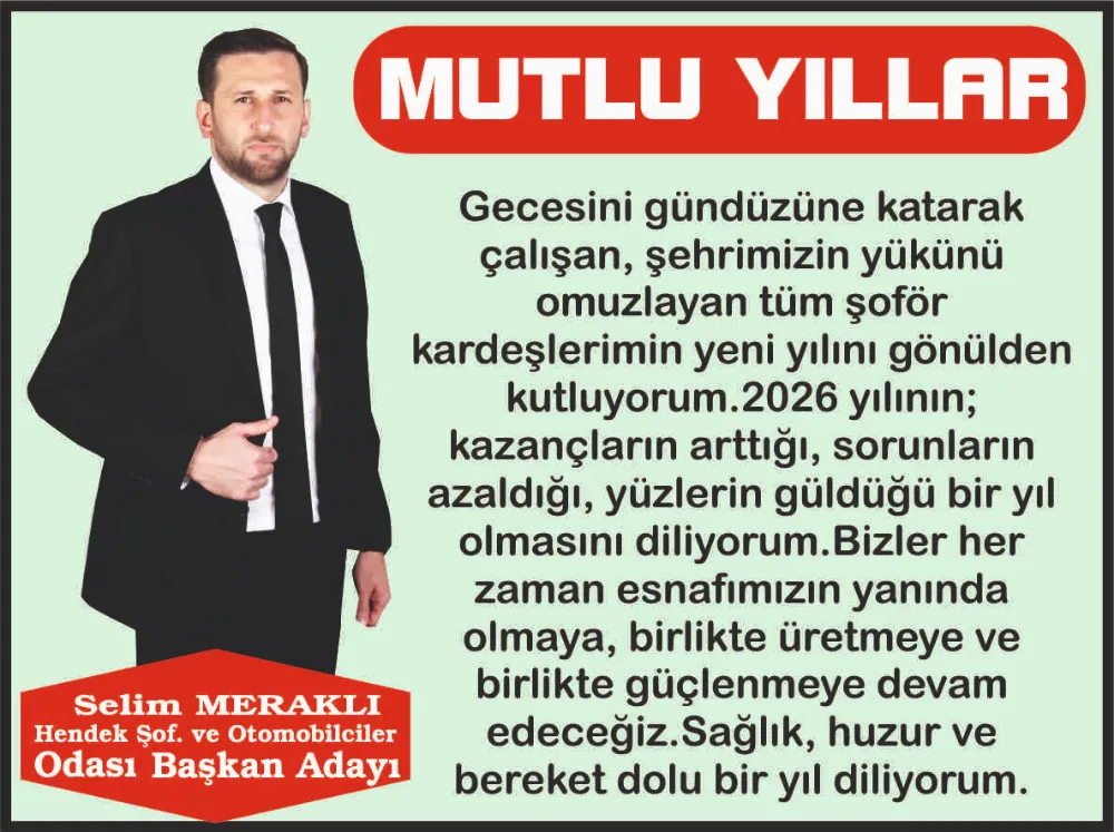 Hendek Şoförler ve Otomobilciler Odası başkanlık seçimlerinde aday olduğunu açıklayan Selim Meraklı yayınladığı mesaj ile birlikte çalışmaya devam edeceğiz, mutlu yıllar dedi.