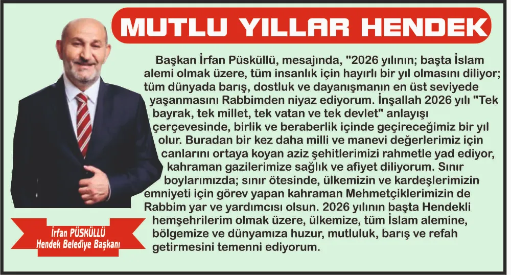 Hendek Belediye Başkanı İrfan Püsküllü yayınladığı yeni mesajında 2026 yılının başta Hendekli hemşehrilerimiz olmak üzere ülkemize, tüm İslam alemine, dünyamıza mutluluk, barış ve refah getirmesi temennisinde bulundu.
