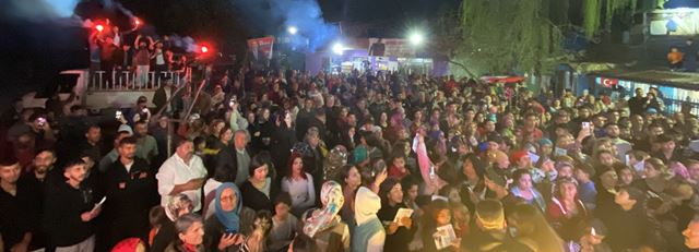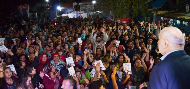 Başkan adayı Püsküllü’yü meşaleler eşliğinde karşılayan Turanlar mahallesi sakinlerinin müzik eşliğinde sergiledikleri figürler mahalleyi karnaval havasına dönüştürdü.