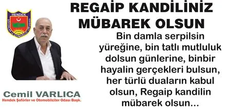 Hendek Şoförler ve Otomobilciler Odası Başkanı Cemil Varlıca İslam Aleminin Regaip Kandilini şu sözlerle kutladı.
