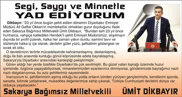 Sakarya Bağımsız Milletvekili Ümit Dikbayır, Şehit Emniyet Müdürümüz Ali Gaffar Okkan'ı ölüm yıl dönümünde şu sözlerle andı.